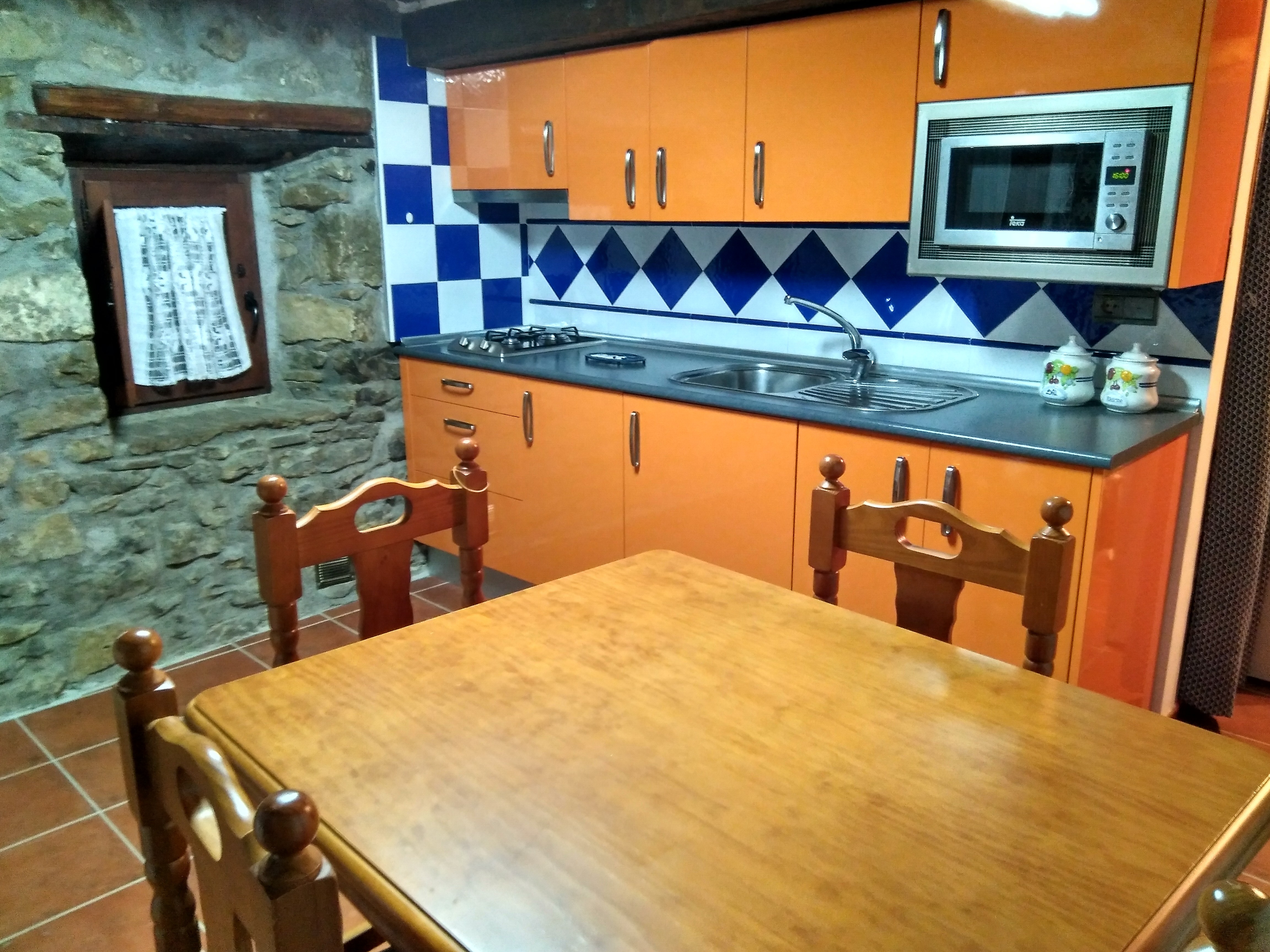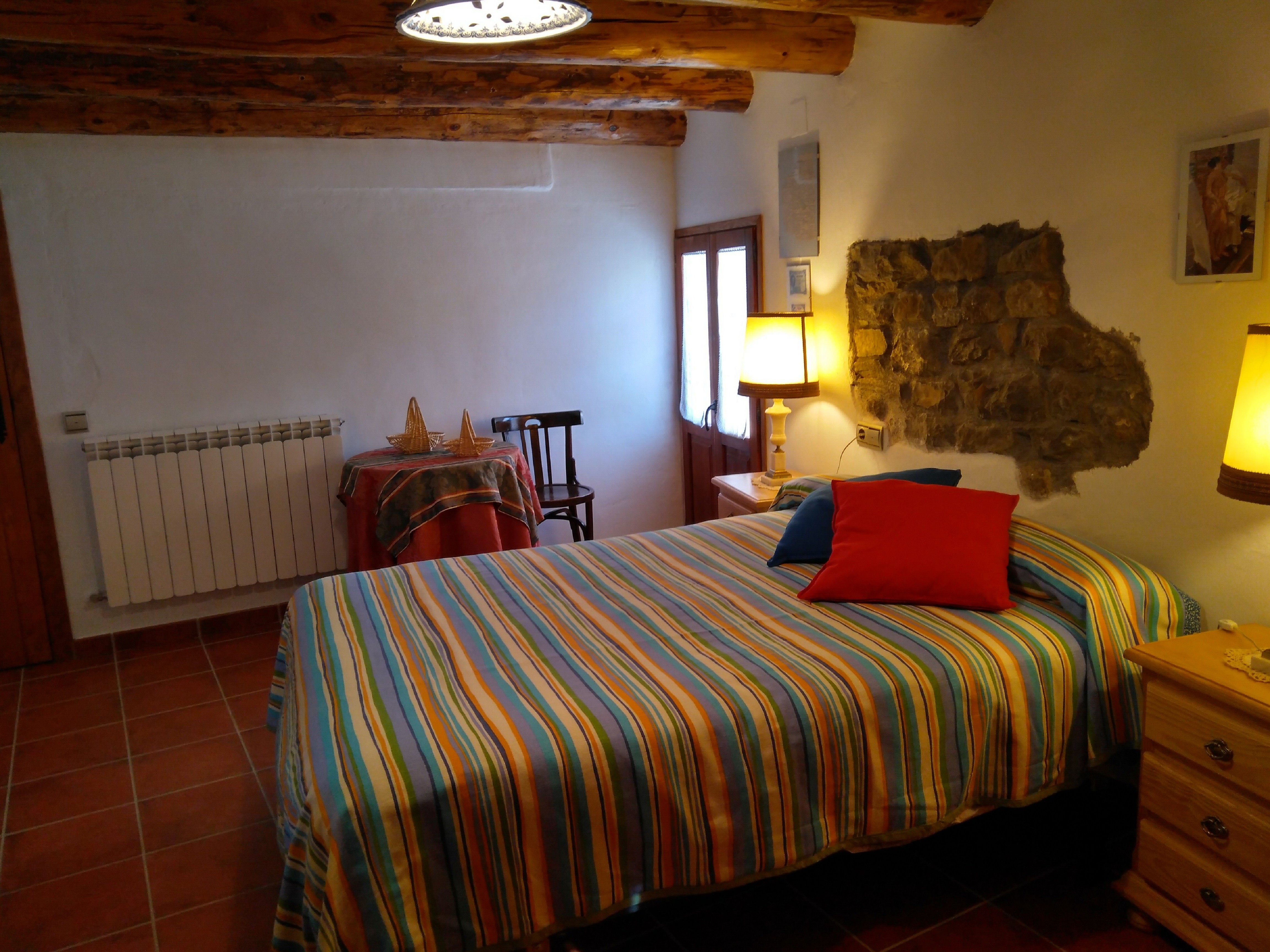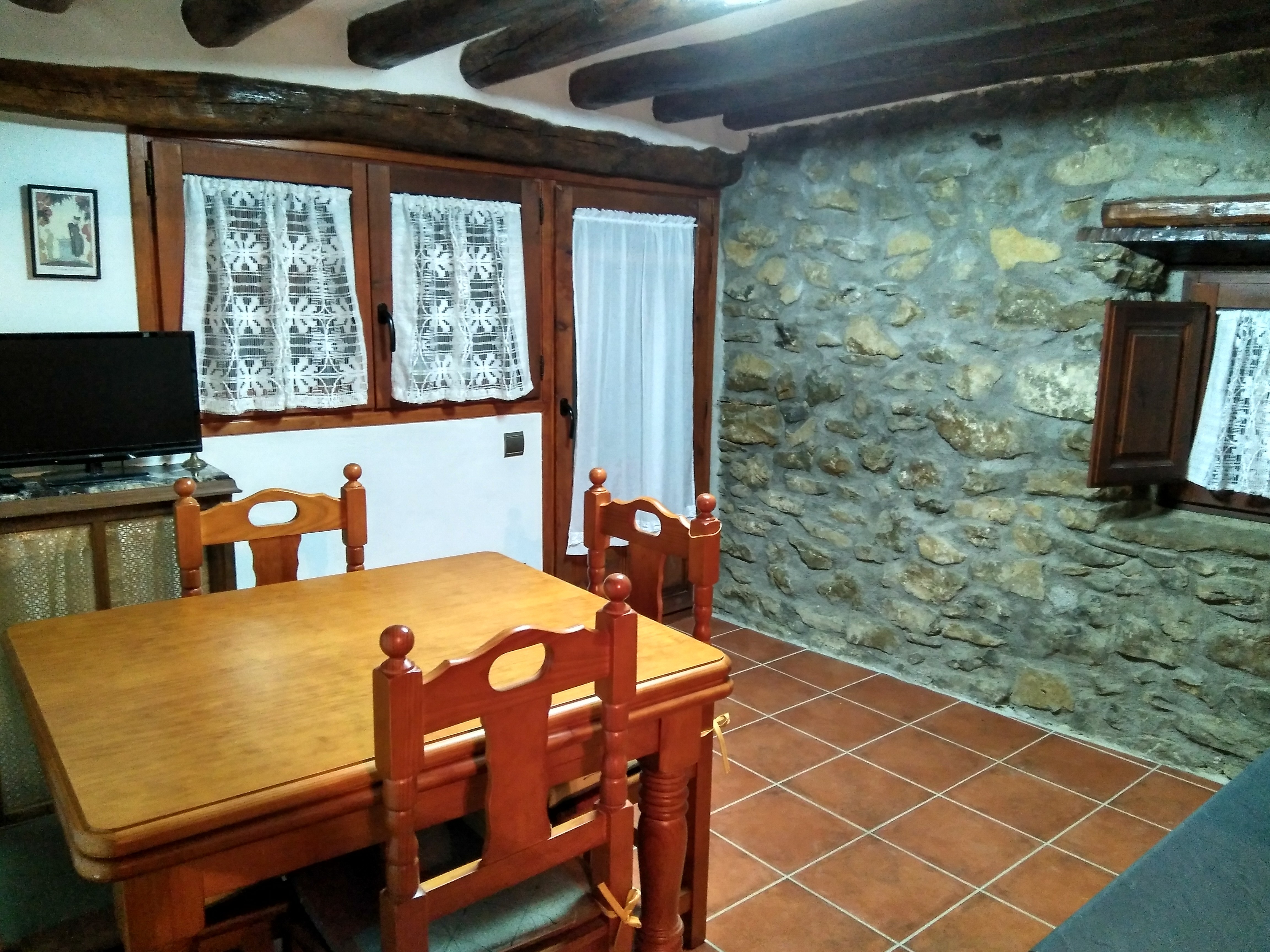 La casa principal es de 5 plazas y esta equipada con todo lo necesario, tiene calefaccion y esta compuesta de planta baja con recibidor, primer planta con salon , chimenea , baño y una habitacion doble de matrimonio. En la segunda planta se encuentra la cocina-comedor, baño , una habitacion con dos camas y terraza acristalada de mas de 20mts.con bonitas vistas.La propiedad dispone de una zona comunitaria con barbacoa cerrada , una pergola con mesa de ping pong y una terraza con bonitas vistas